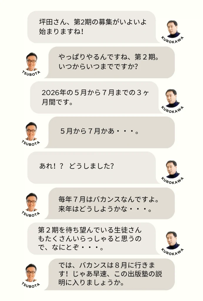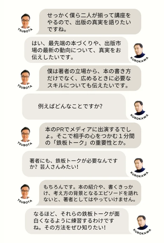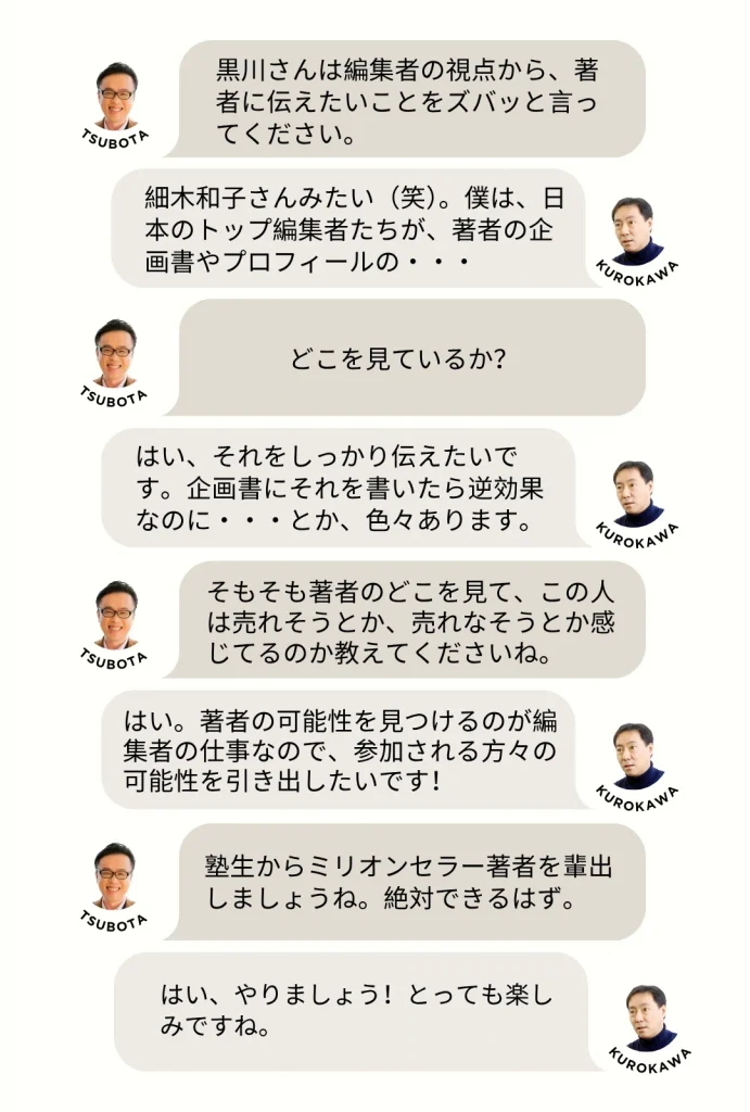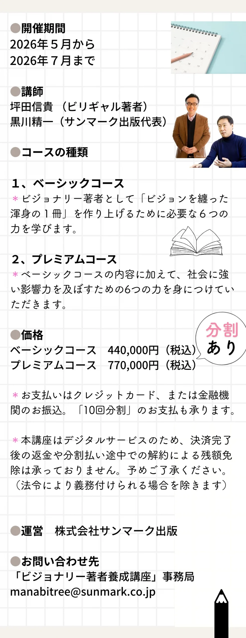 また、本講座の卒業生専用のオンラインサロン「ビジョナリー著者サロン」(月額2,000円予定)にご入会いただけます。そこでは、出版にまつわる様々な情報、月イチの講演会、また坪田×黒川の本づくりの現場をリアルタイムでお見せするなど、卒業後に有益なサロンにする予定です。