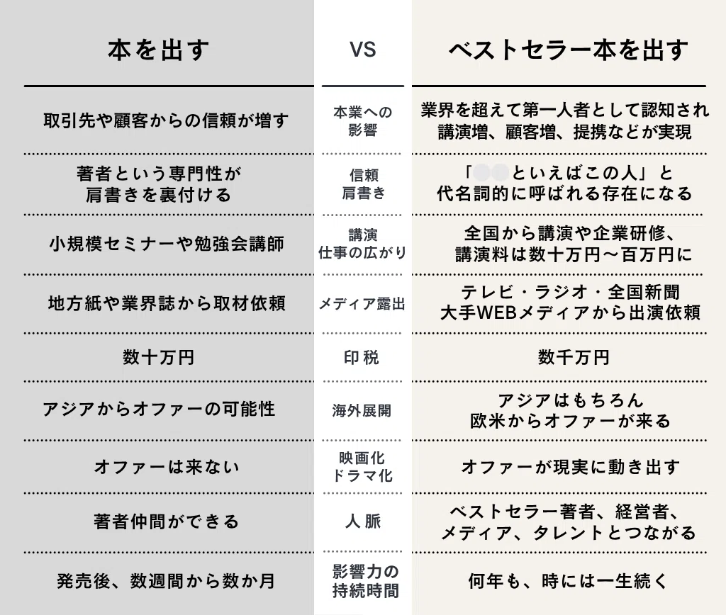「本を出す」と「ベストセラー本を出す」では、得られるメリットは別世界です。