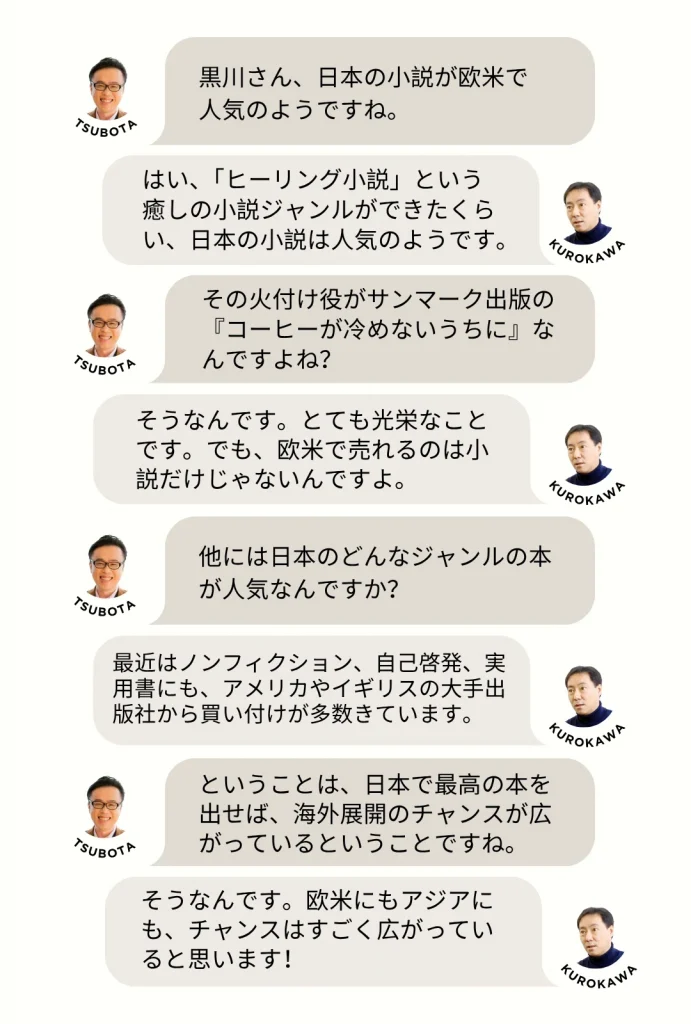 海外での実績も豊富で、『人生がときめく 片づけの魔法』(近藤麻理恵)は世界1500万部、『コーヒーが冷めないうちに』(川口俊和)は世界850万部、『生き方』(稲盛和夫)は世界800万部など、アジアはもちろん欧米でも躍進し続けています。