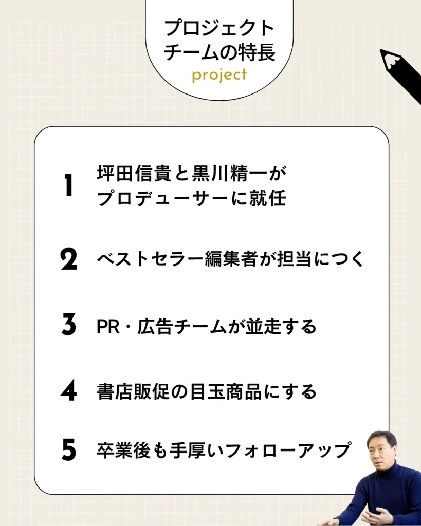 しかし、このプロジェクトでは、これまでにベストセラー(最低でも10万部以上)を出してきた編集者が担当につきます。ベストセラー編集者が担当することが約束されているケースは、他に類を見ません。