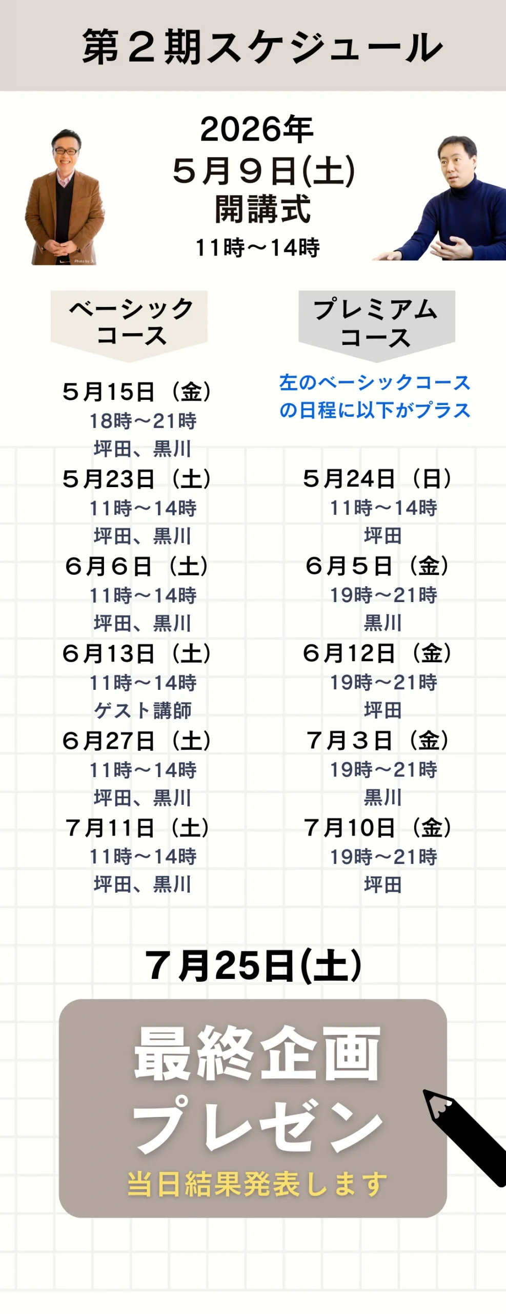 プレミアムコースでは、ベーシックの内容に加えて、実際に社会やメディアに影響を与えるための応用力(販売戦略・メディア対応・収益モデル構築など)をより実践的に学ぶ構成となっています。